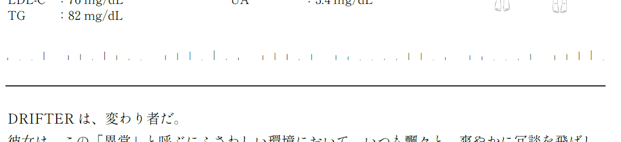 ファイル中央部分に薄い縦線が羅列された部分があるのですが、これは特殊なフォントが割り当てられたもので、編集ソフトで選択するとUnicodeエスケープシーケンス (opens in a new tab)で表現された文字列が得られるようになっていました。